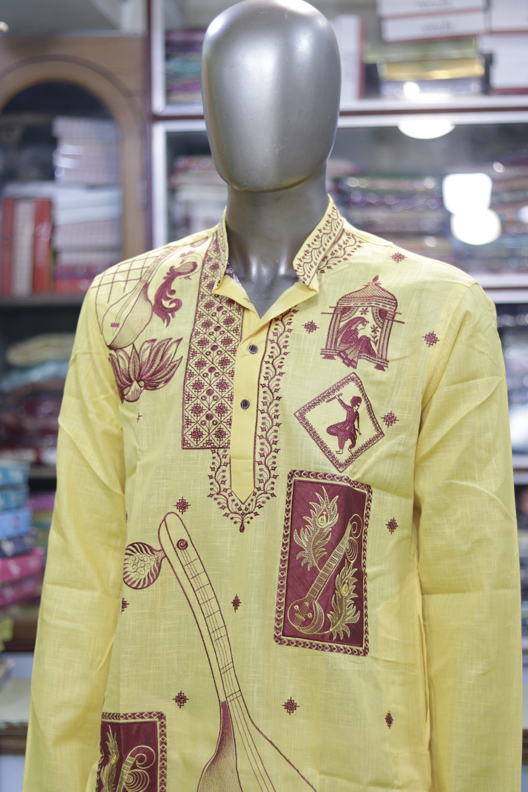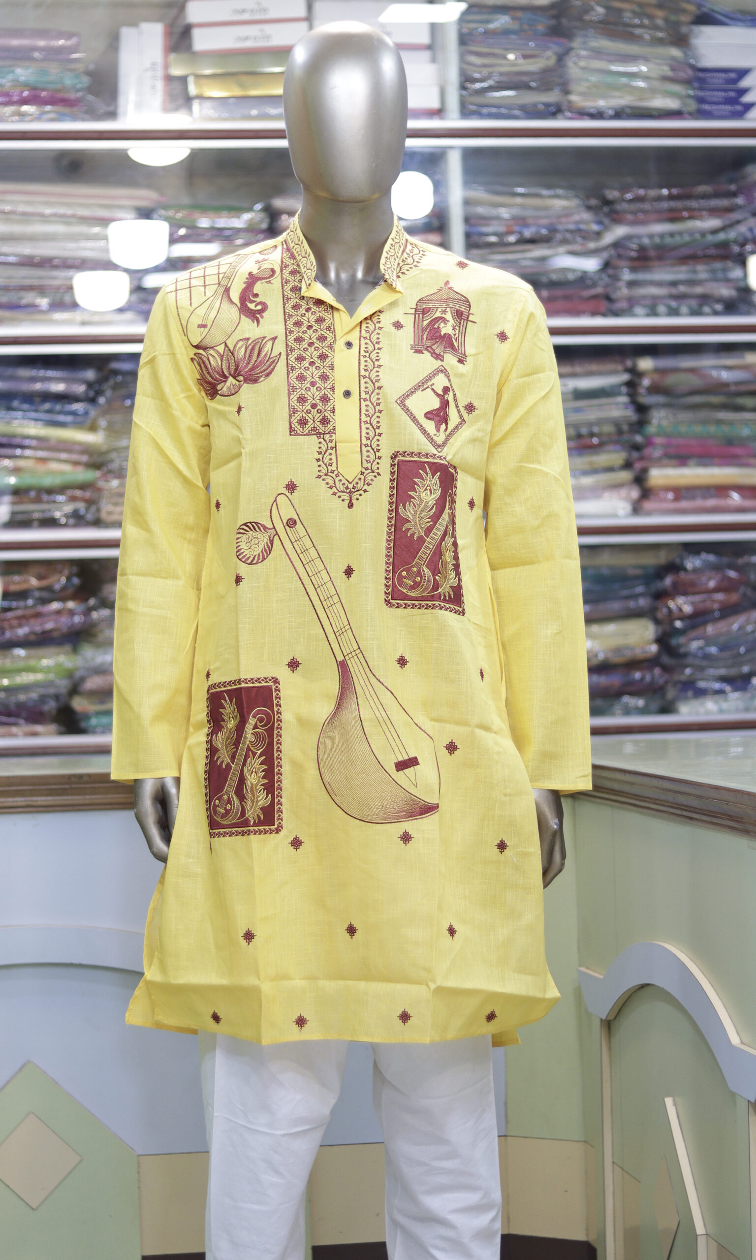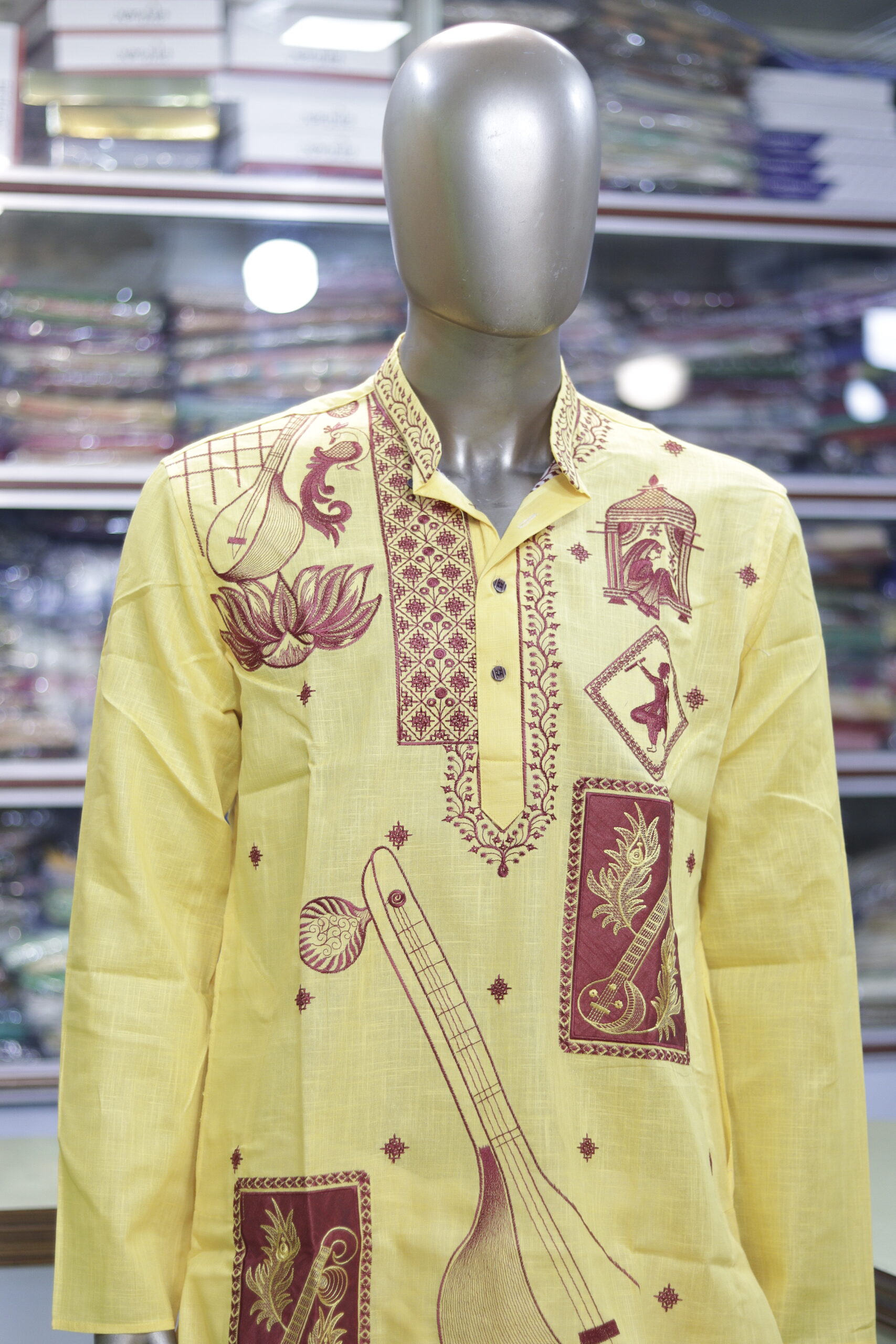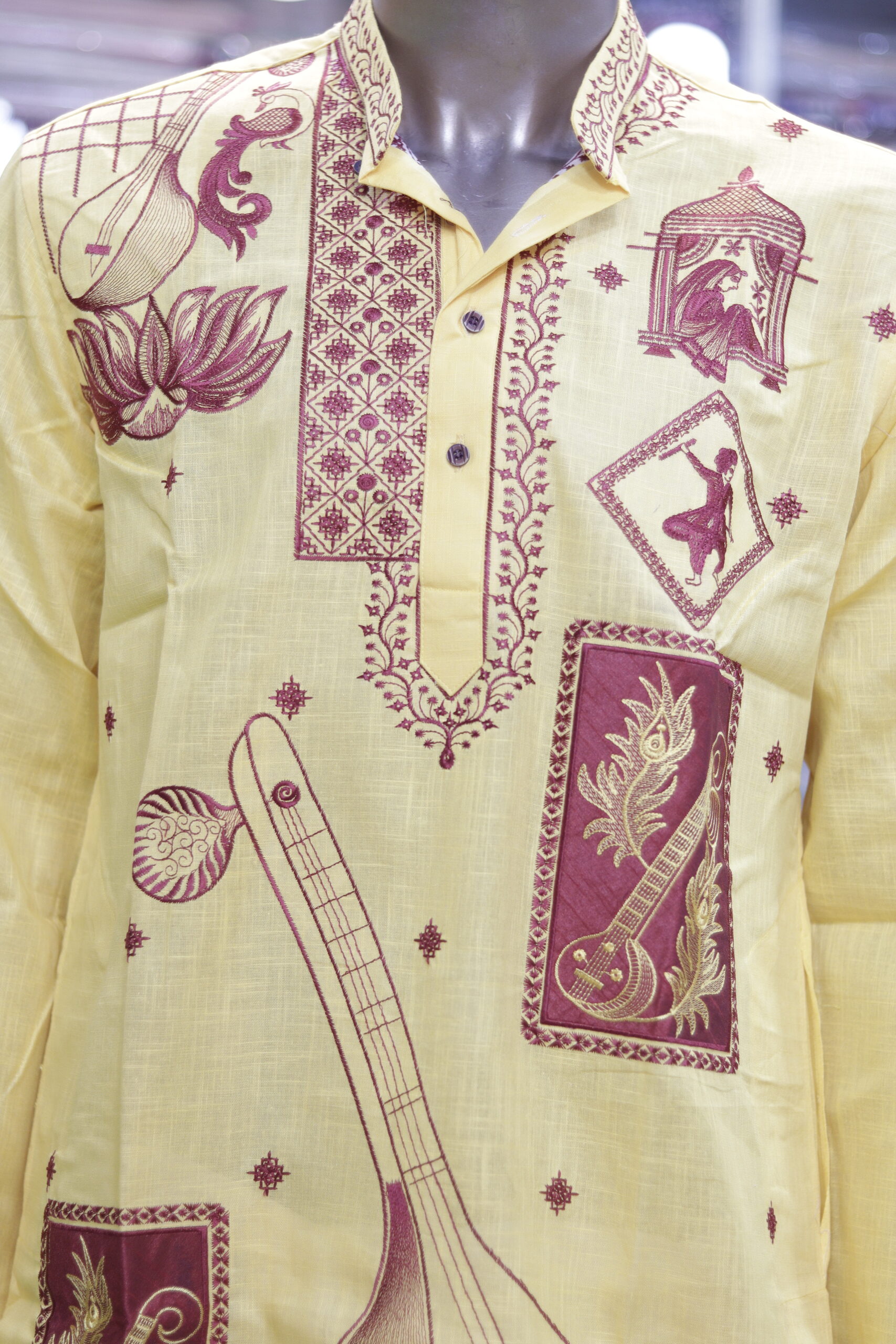 Celebrate heritage and culture with this stunning hand-printed cotton kurta, designed to reflect the essence of Indian tradition. The soft yellow fabric is adorned with intricate maroon prints featuring musical instruments, classical dancers, lotus motifs, and artistic patterns, making it a perfect choice for festive and cultural occasions.