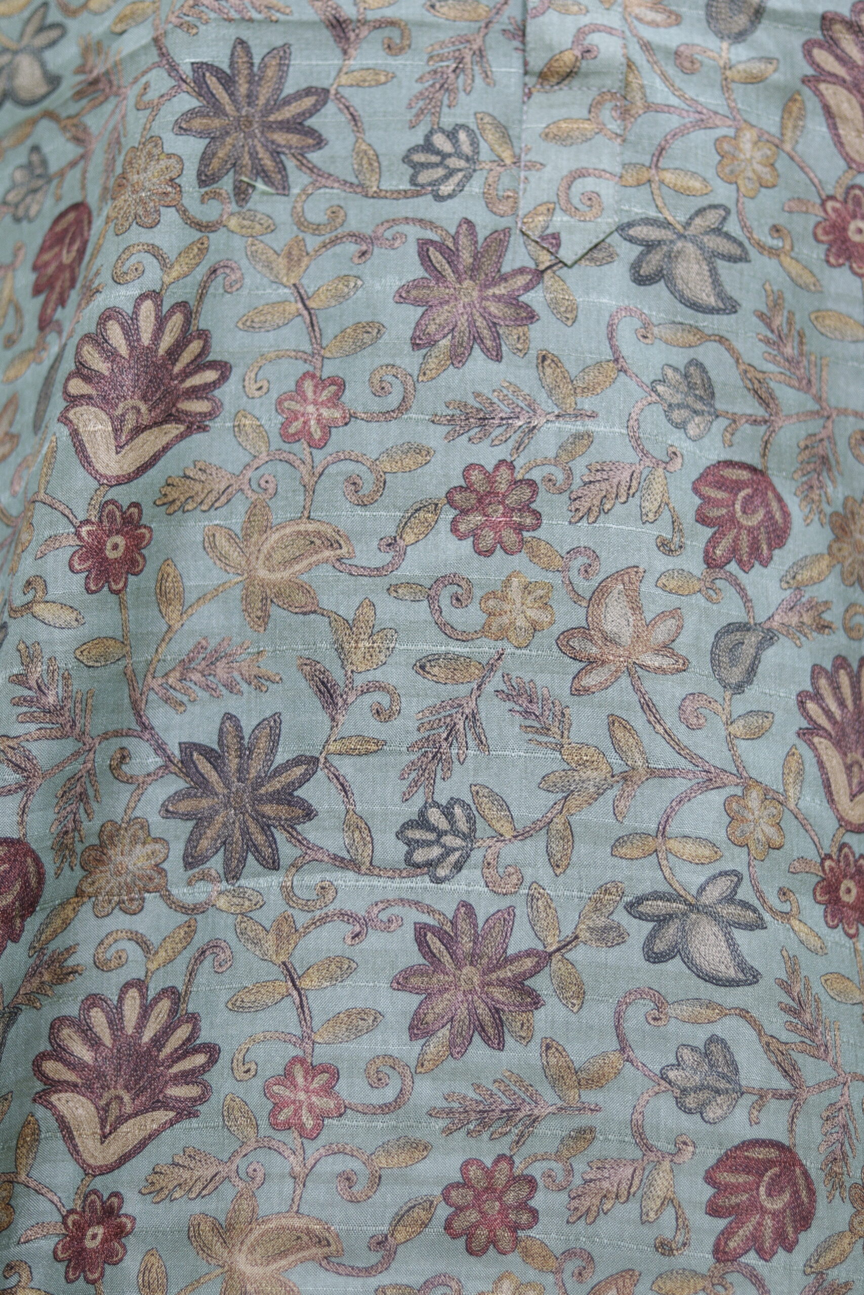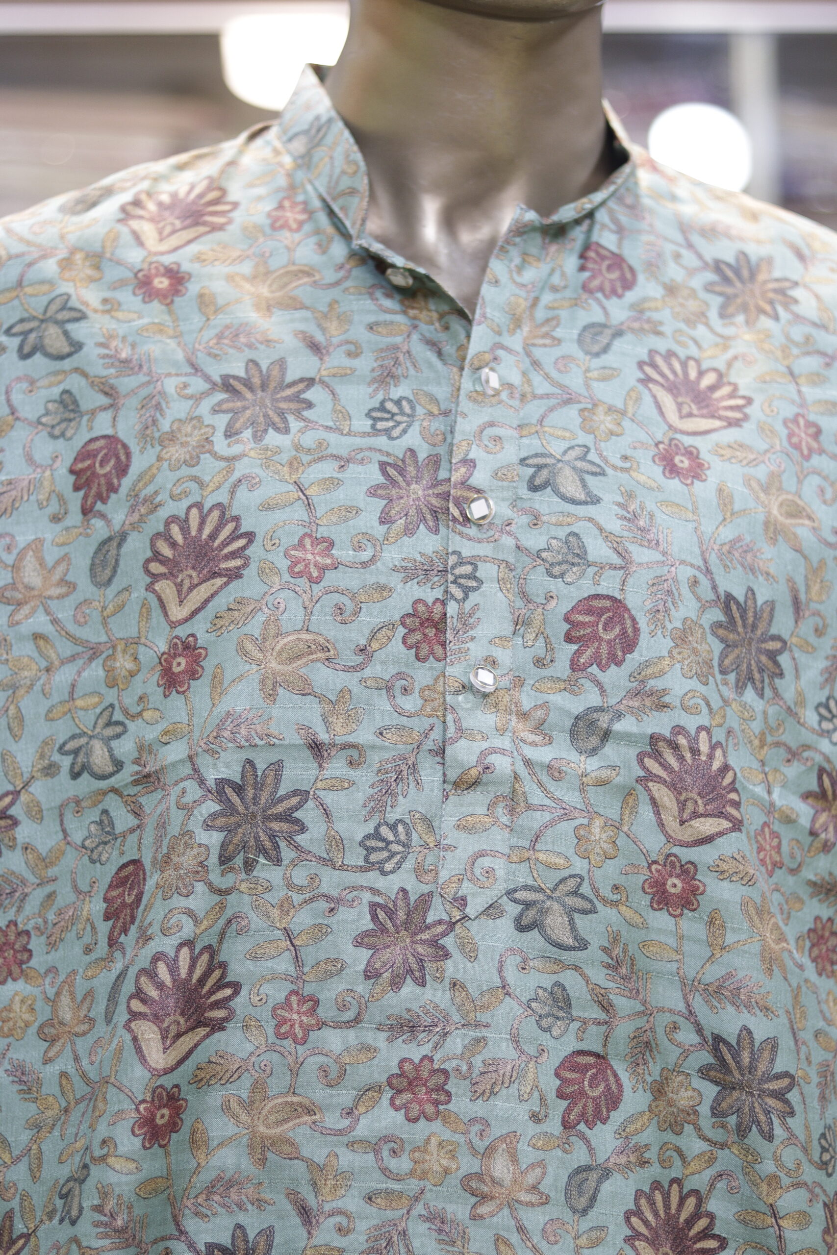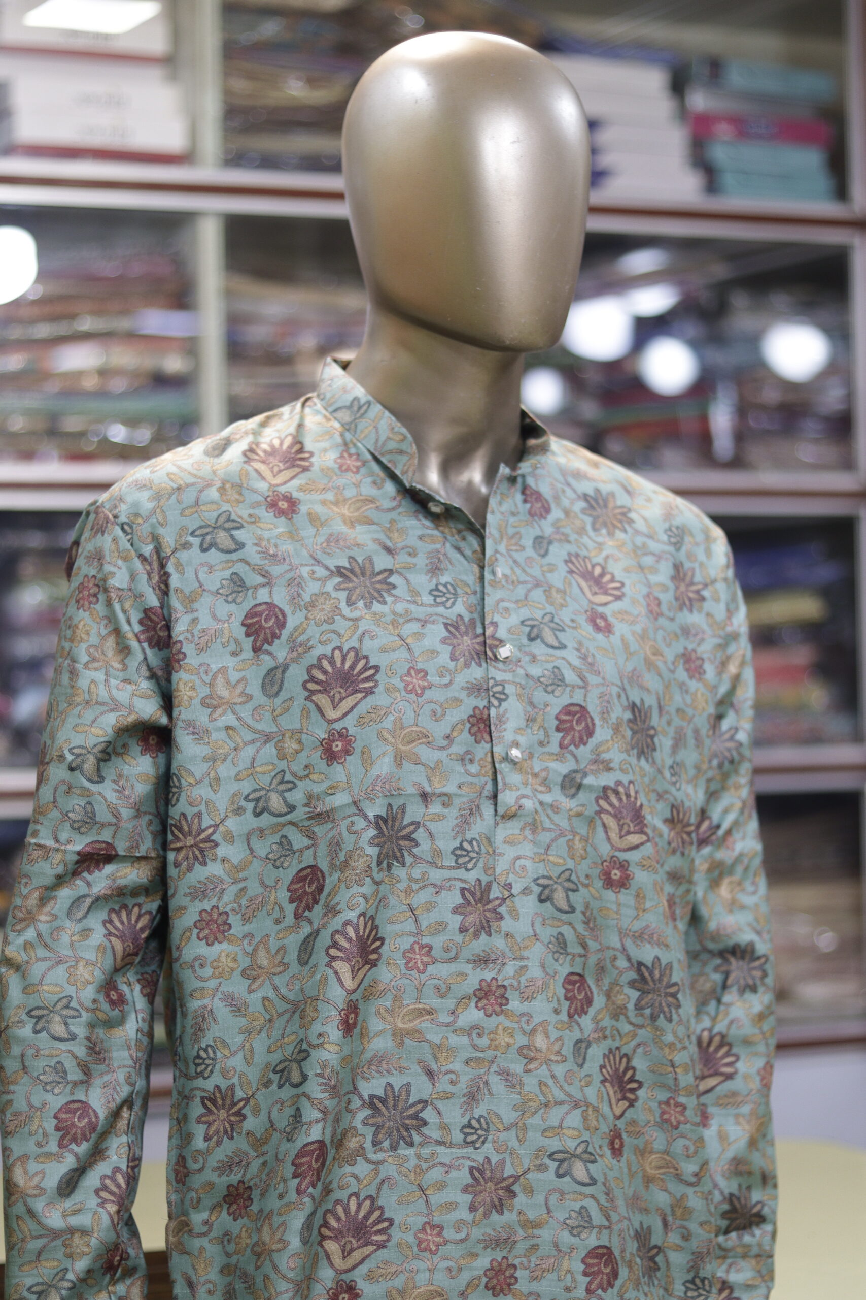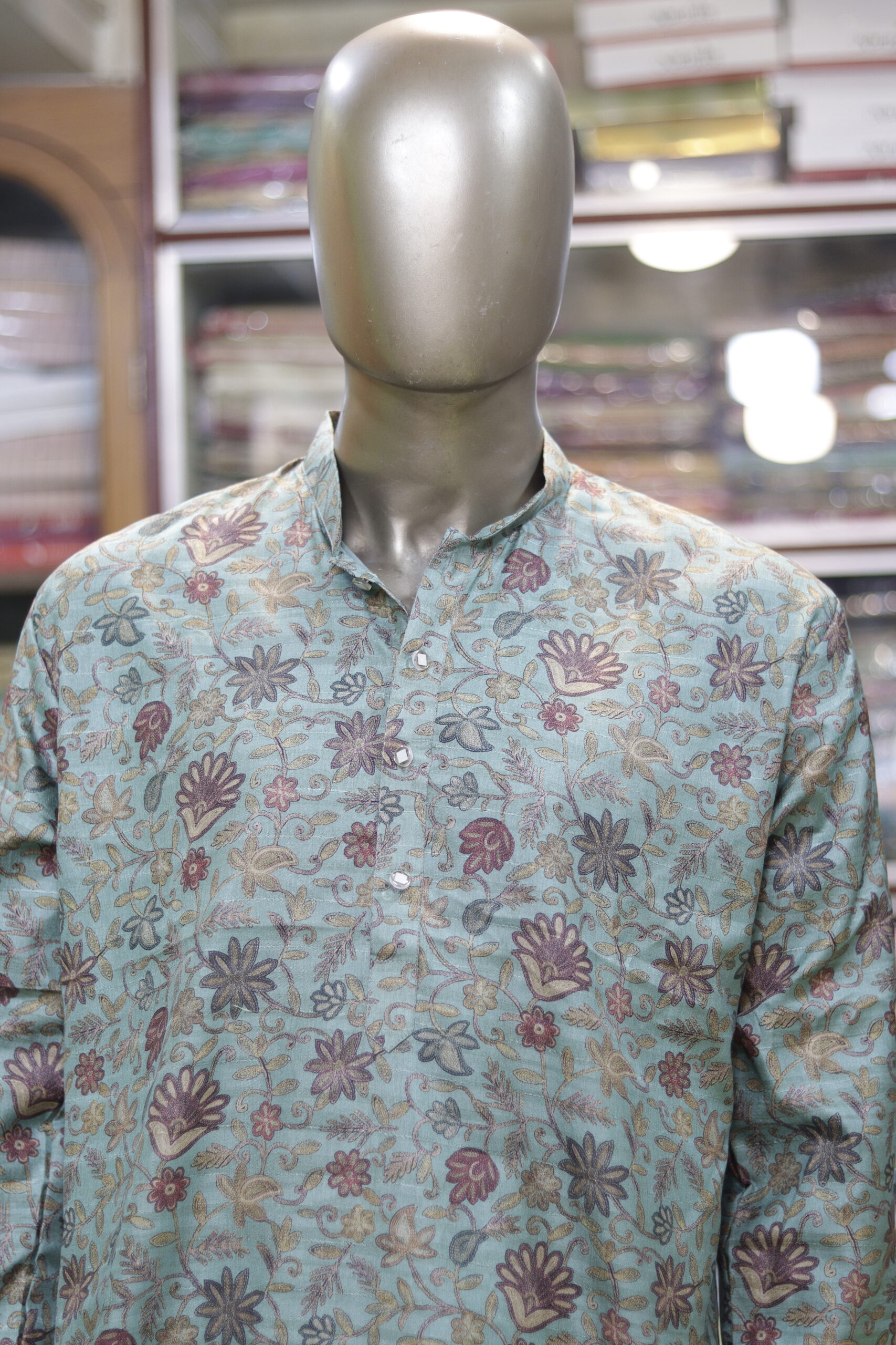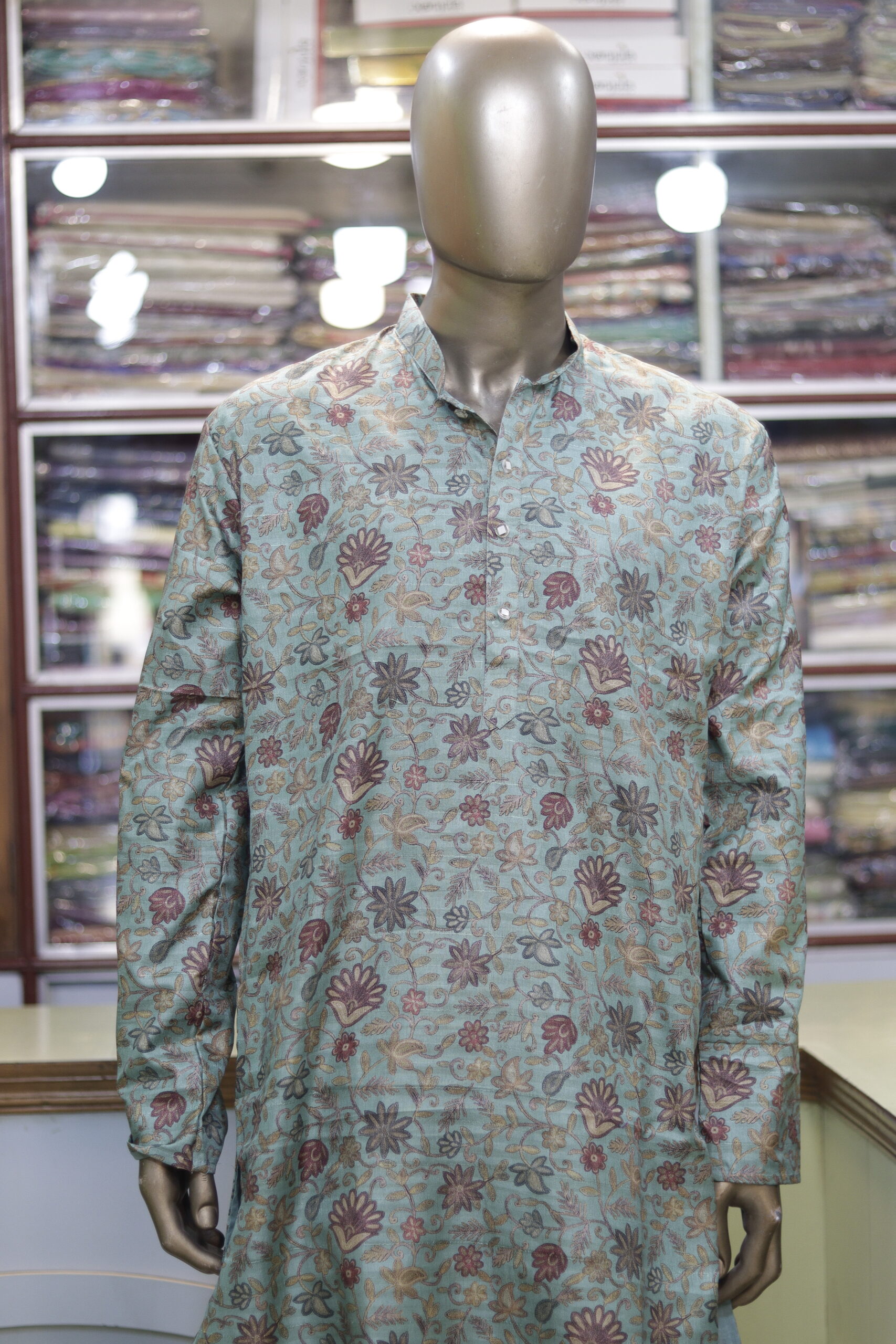Embrace timeless elegance with this beautifully designed floral-printed cotton kurta, ideal for festive occasions, casual gatherings, and cultural celebrations. The soothing pastel green base is adorned with intricate floral patterns in earthy tones, creating a refreshing and sophisticated look.