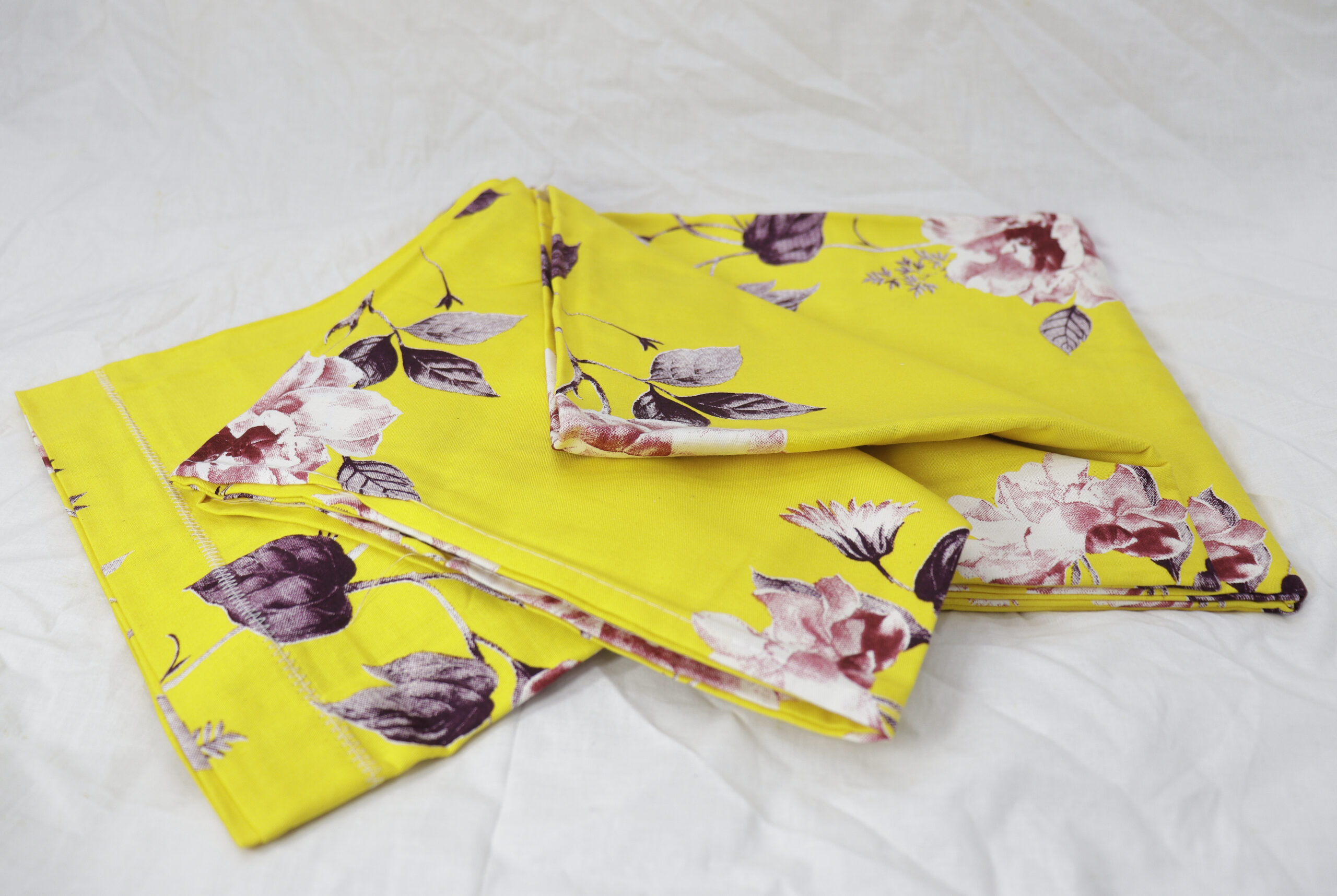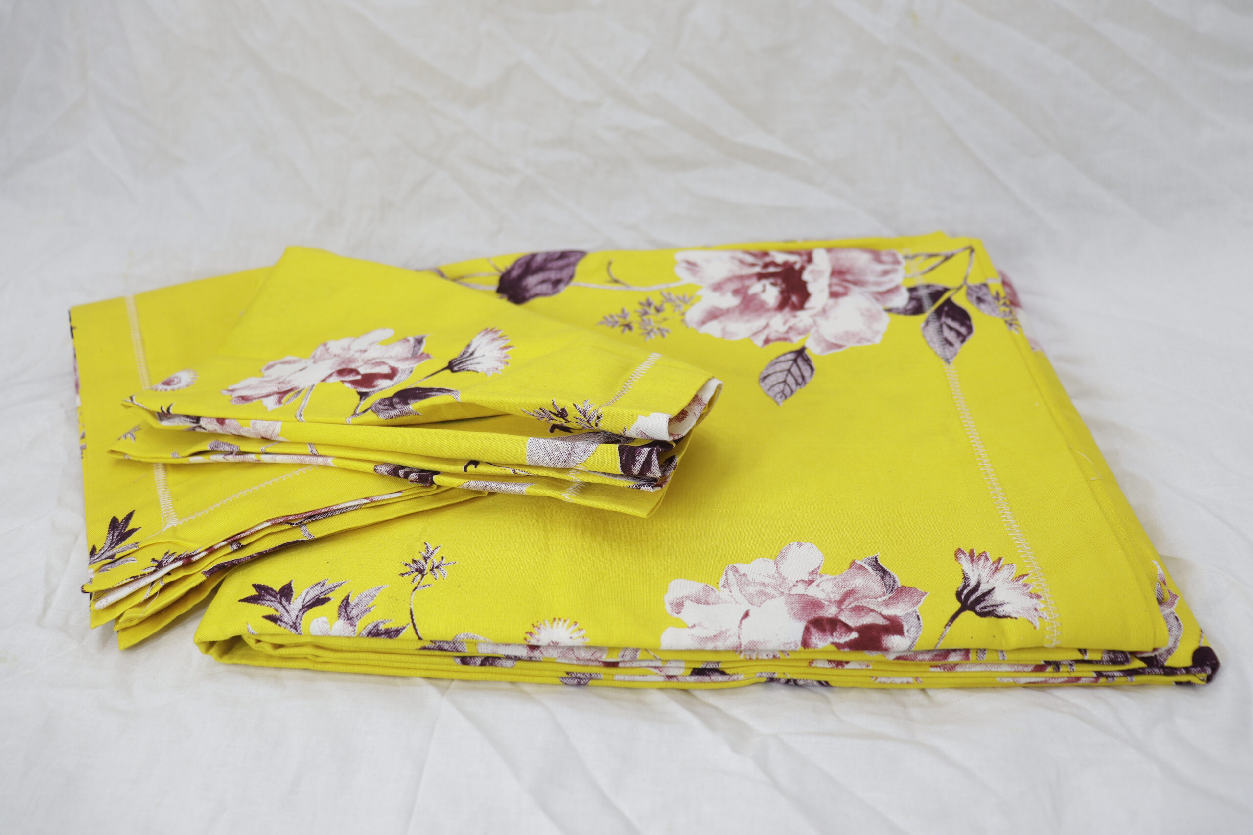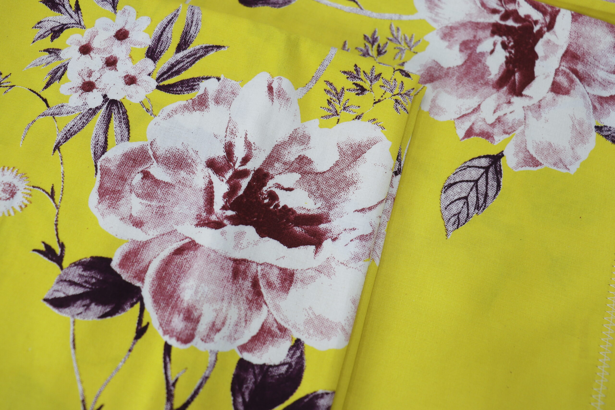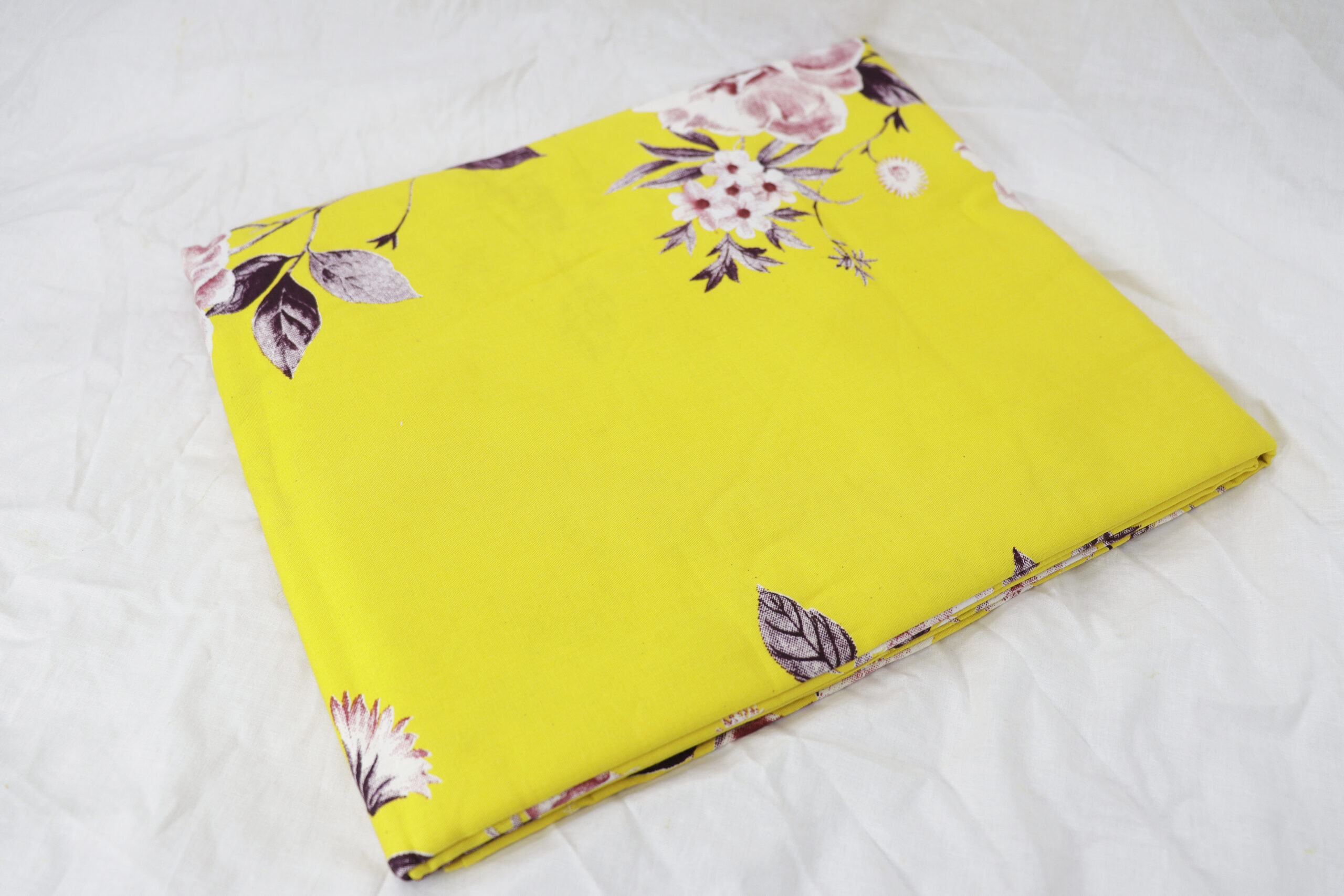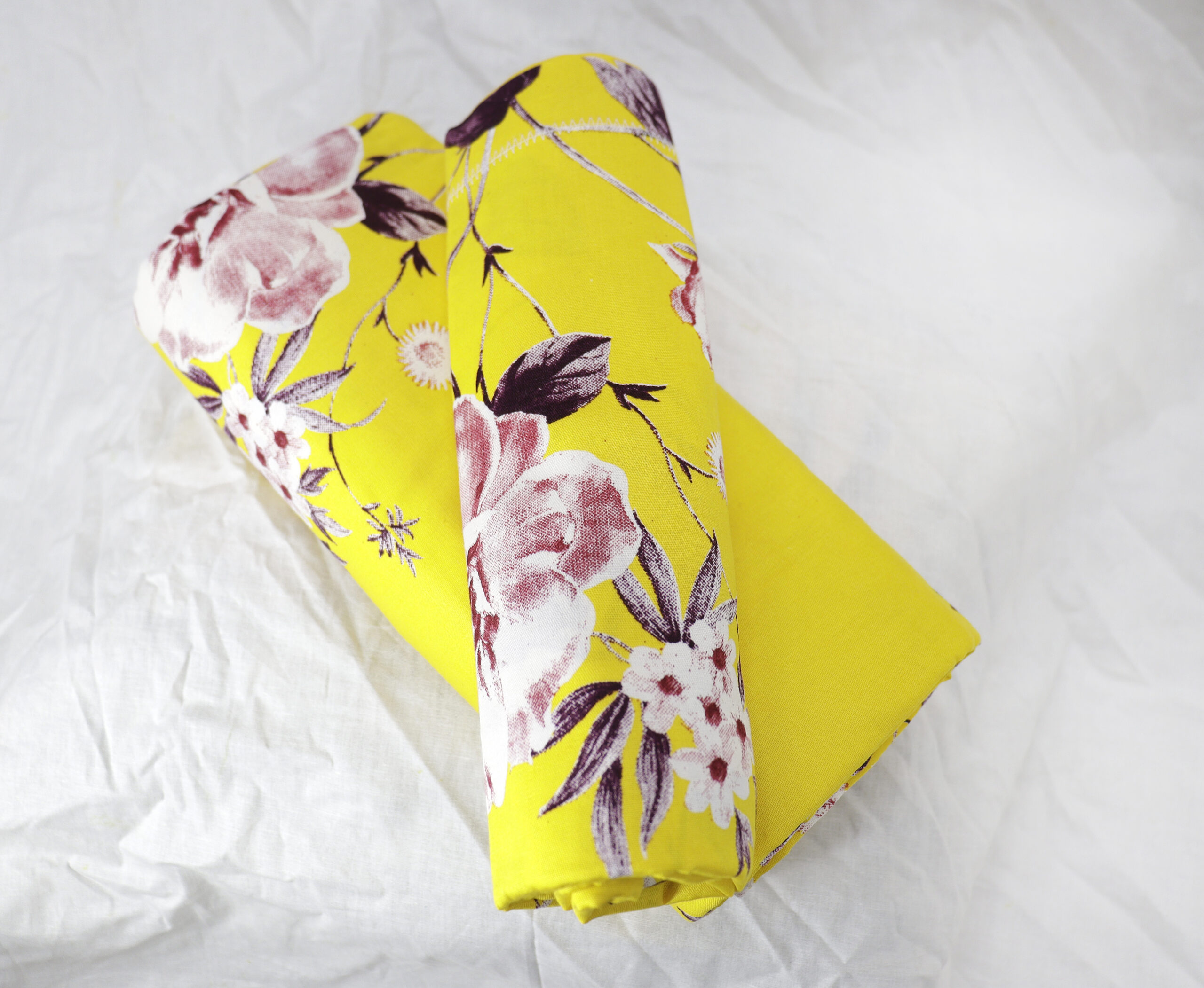 Brighten up your bedroom with the Sunshine Blossom Cotton Bedsheet, featuring a stunning floral print on a vibrant yellow base. Crafted from premium-quality cotton, this bedsheet offers a soft and breathable texture for ultimate comfort. The intricate maroon and white floral design adds a charming and elegant touch, making it perfect for both modern and traditional interiors.